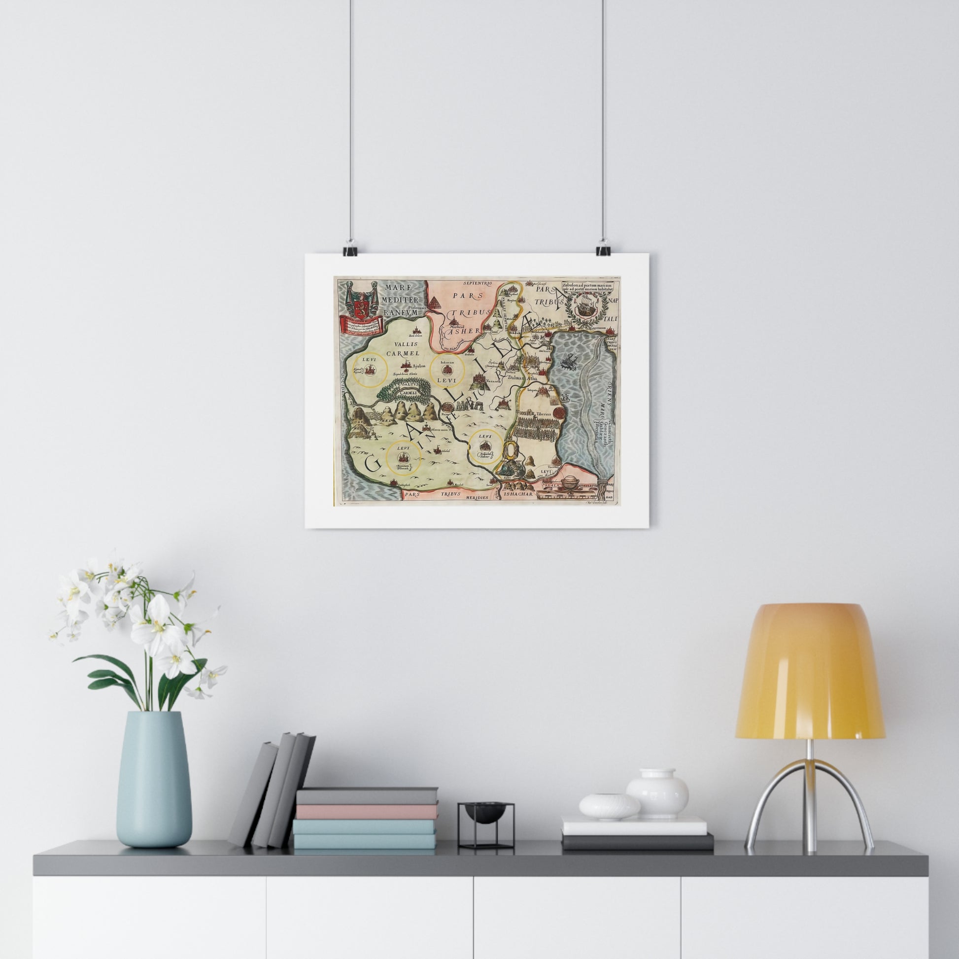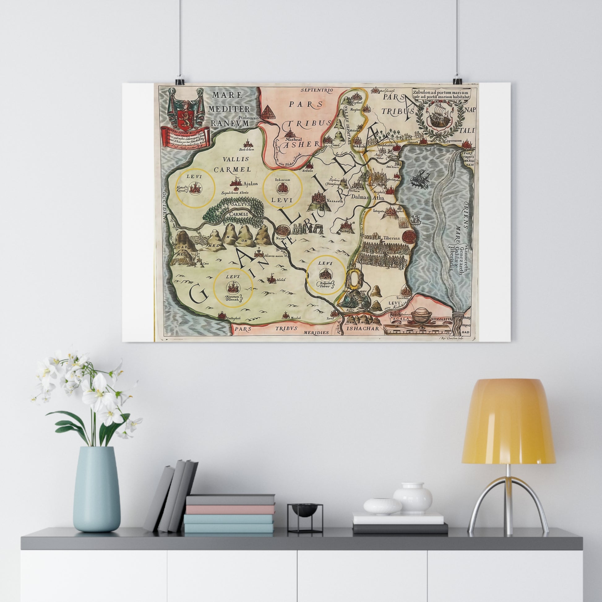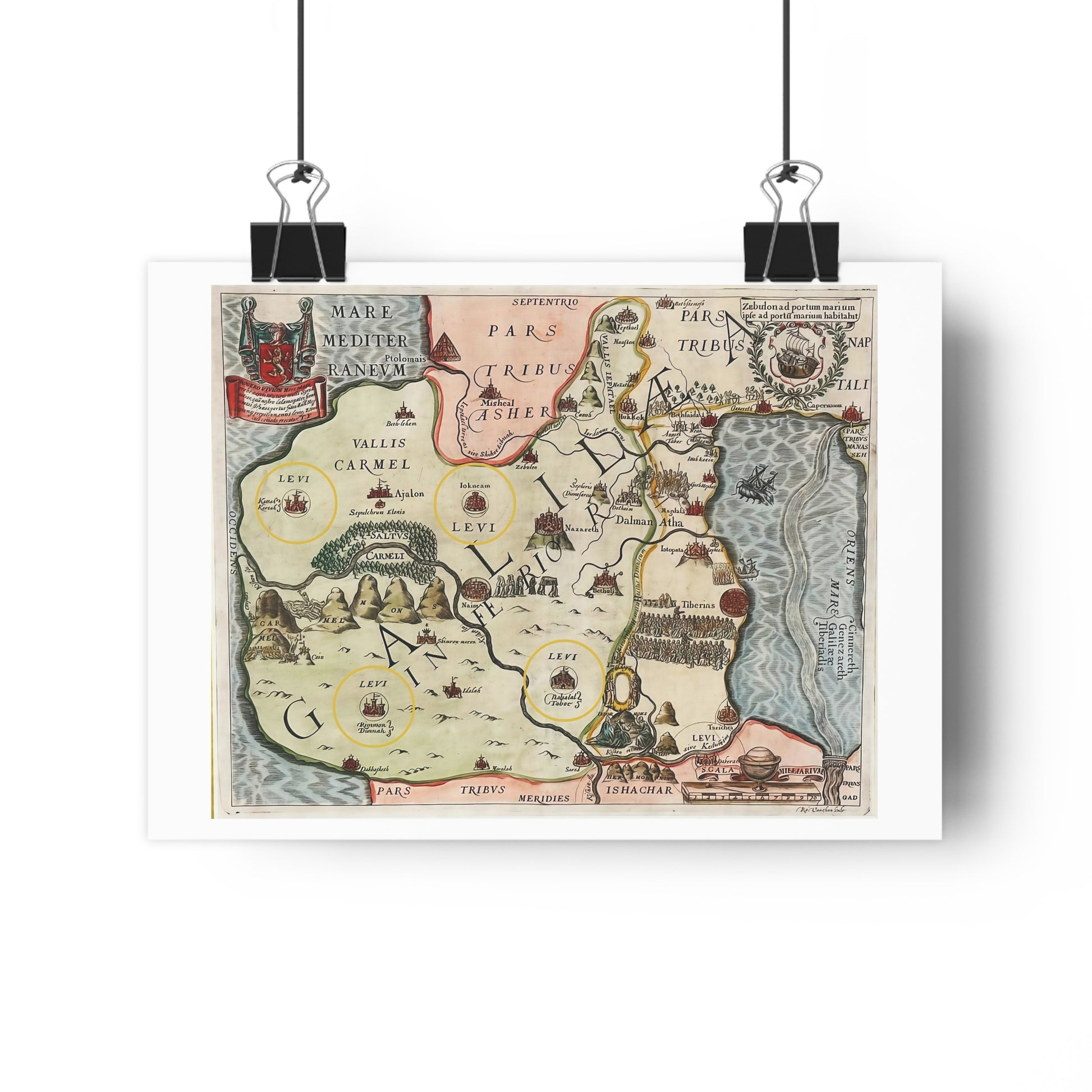 Bring history, faith, and artistry into your home with this striking reproduction of a 17th-century map of Galilee and the Holy Land, originally designed in the ornate style of Dutch biblical cartographers.