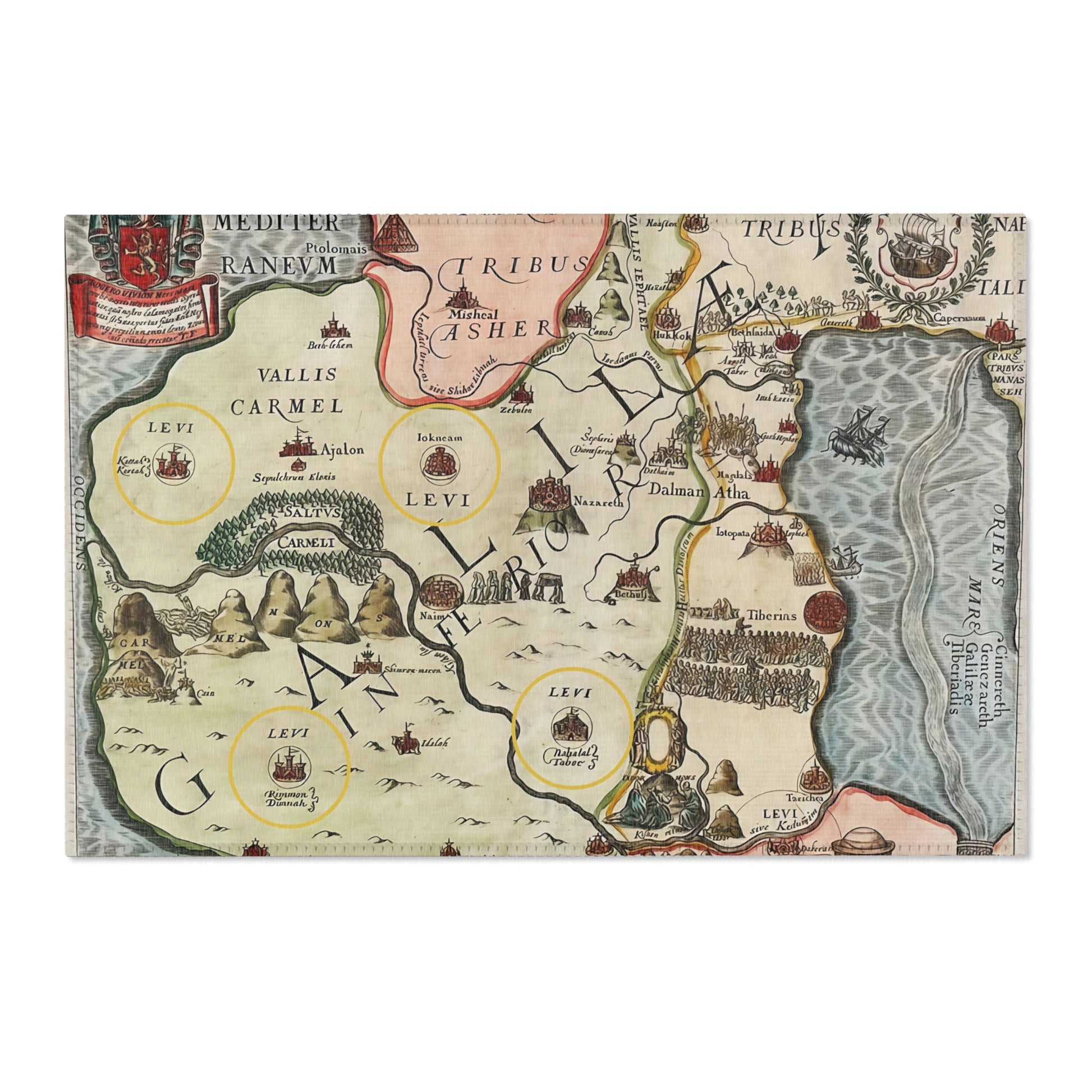 Lavishly hand-colored and filled with intricate detail, the map depicts the lands of the Twelve Tribes of Israel with vivid borders, decorated ships, castles, mountains, and symbolic scenes from scripture. At its heart lies Galilee, with sacred places like Nazareth, Tiberias, and Mount Carmel carefully illustrated, alongside the waters of the Sea of Galilee and the Mediterranean Sea.