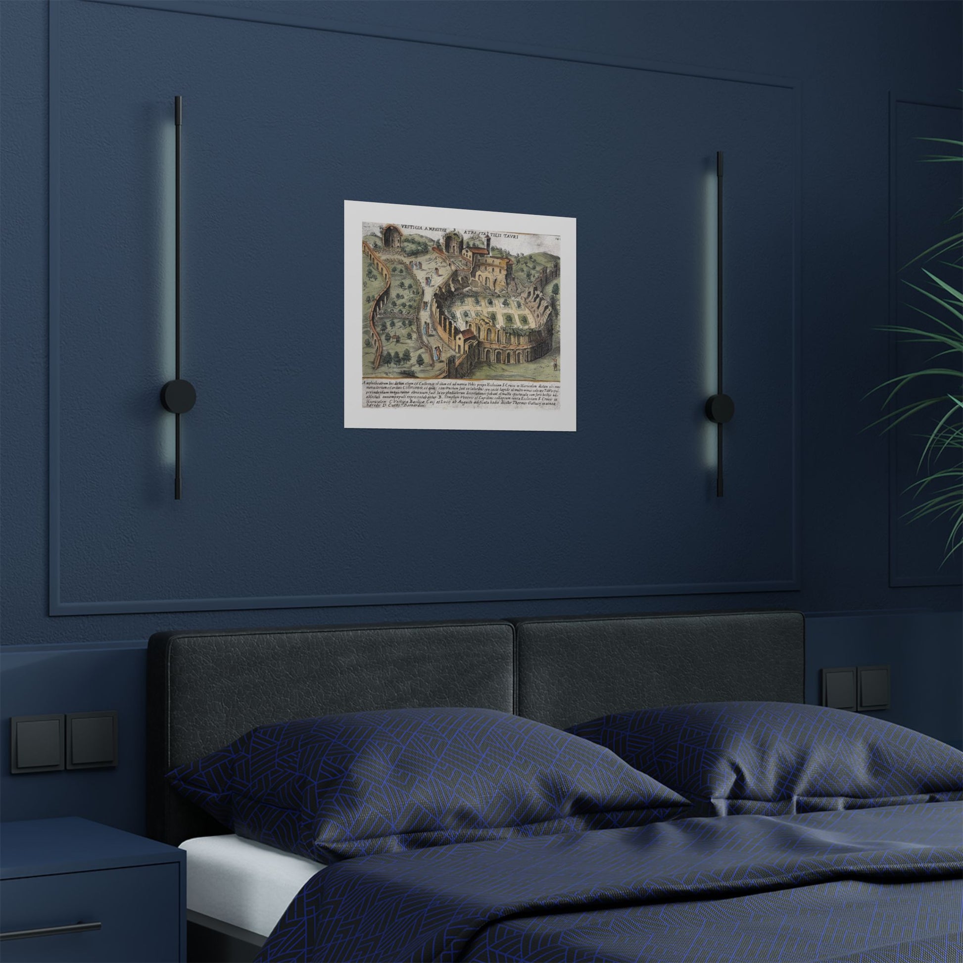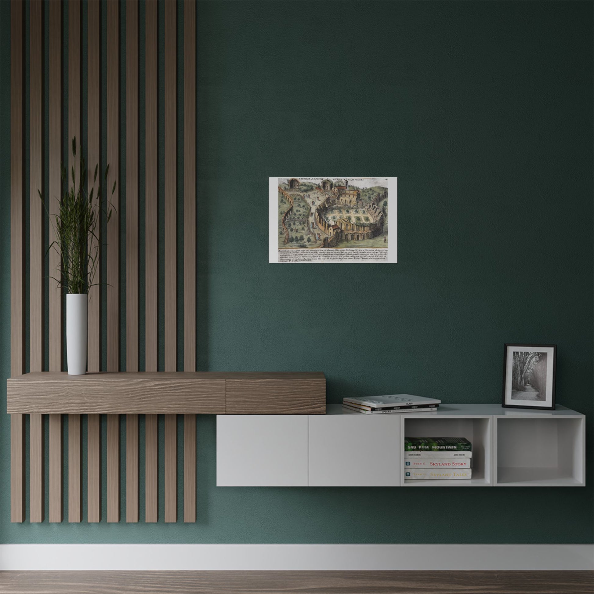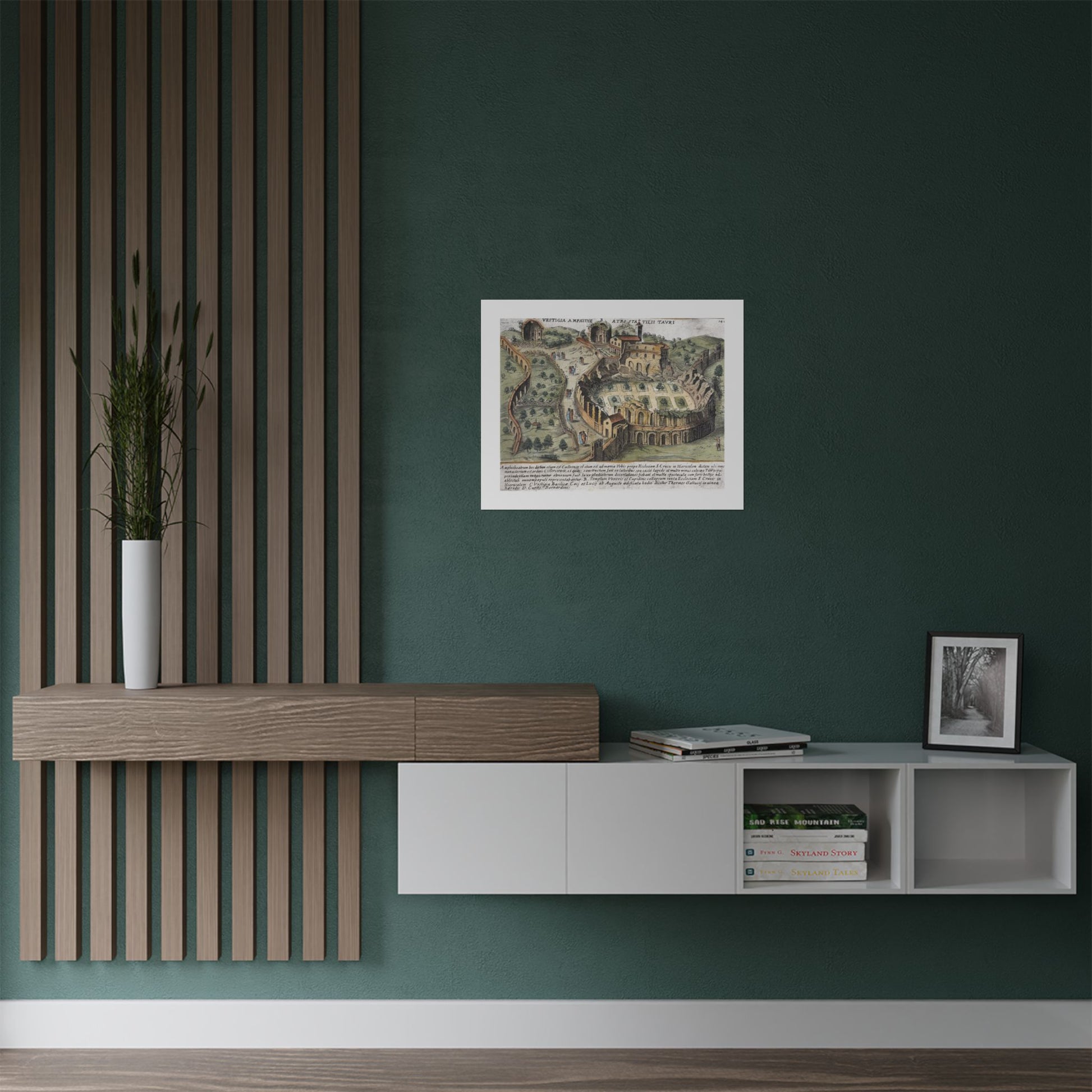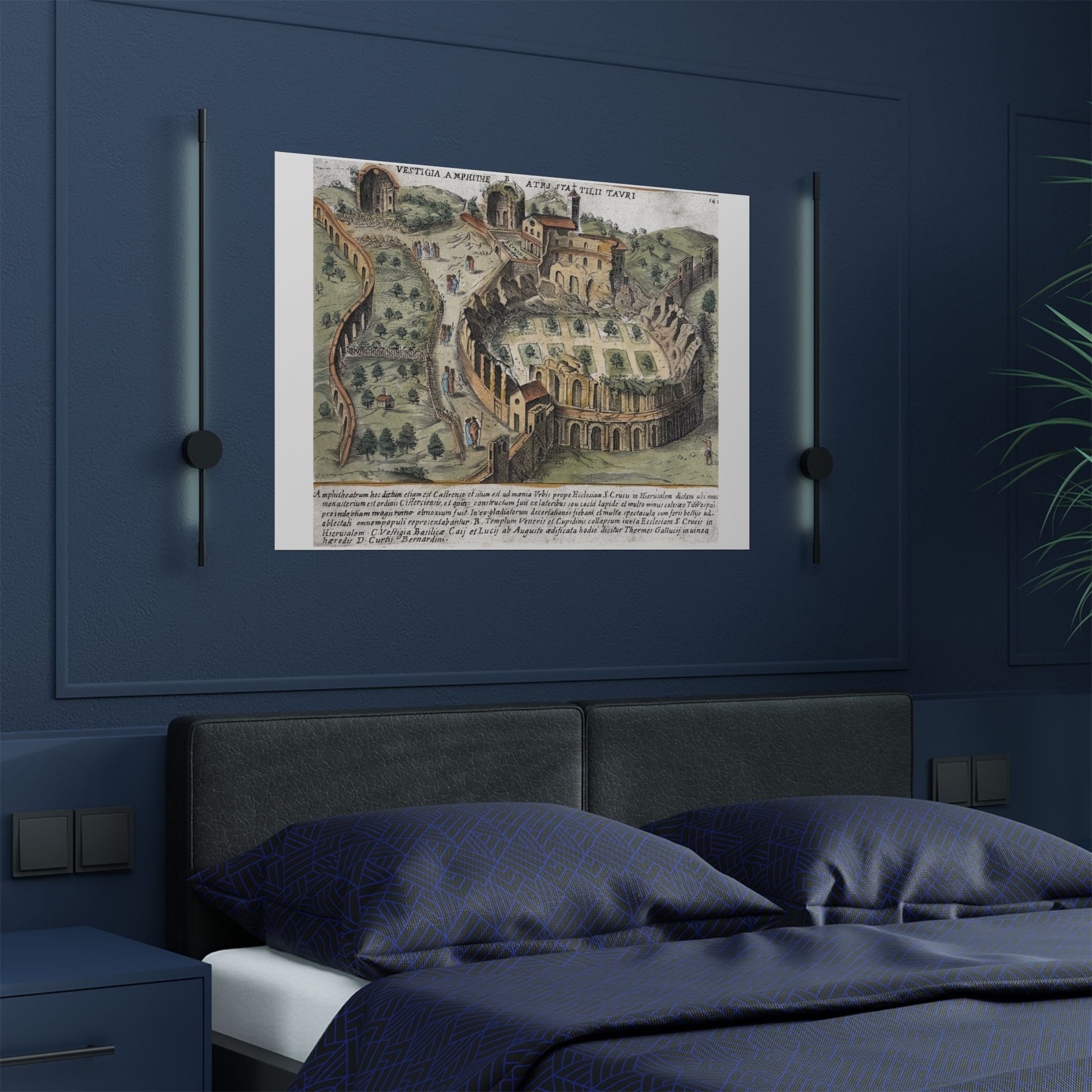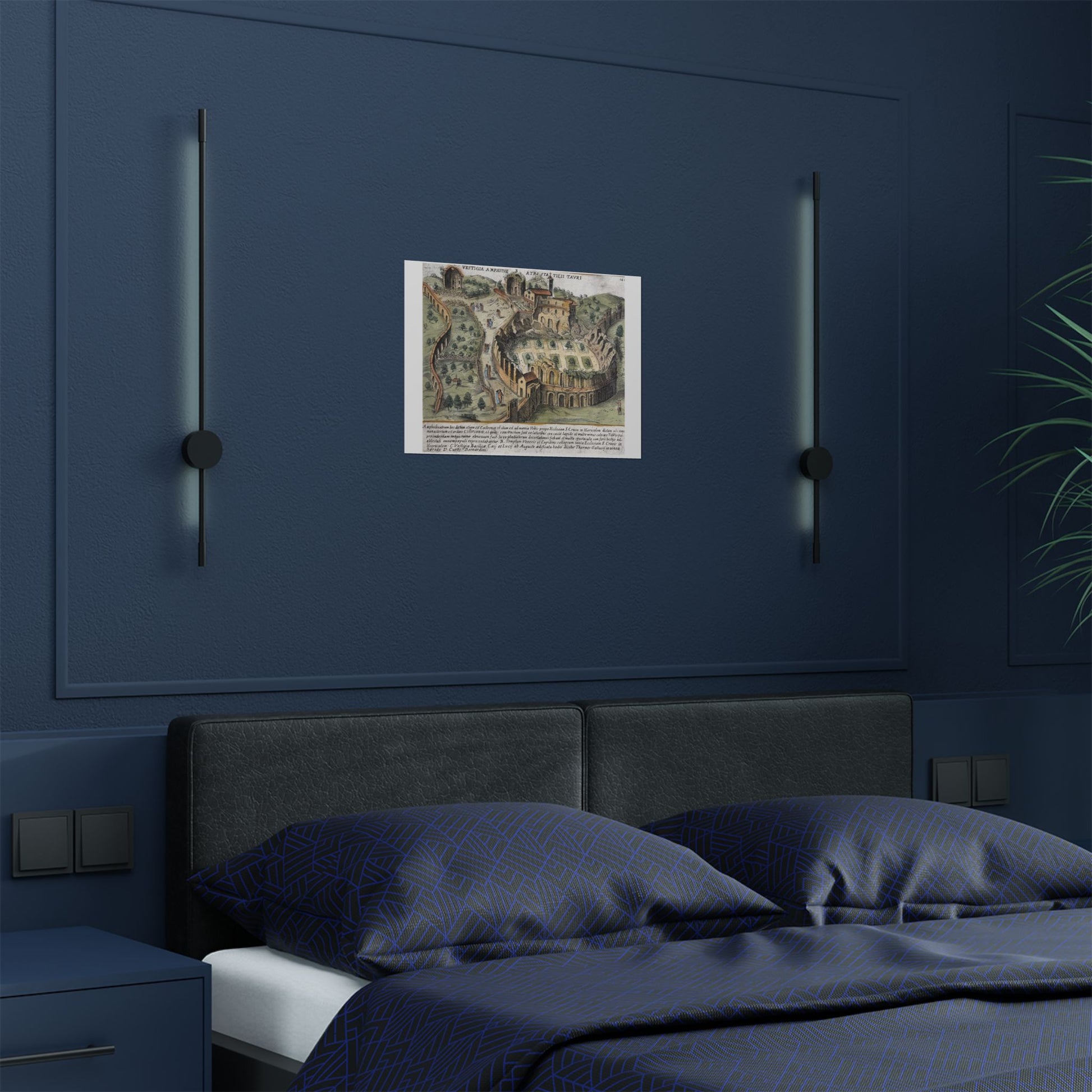 A richly colored 17th-century engraving from Giacomo Lauro’s Antiquae Urbis Splendor, depicting the brick Amphitheatrum Castrense beside Santa Croce in Gerusalemme. Lauro captures the ruined arcades, gardens planted in the arena, walkers on the road, and the sweep of the Aurelian Wall—a lively snapshot of Rome’s ancient remains as they appeared in the early 1600s. The lower caption (A–C) identifies the amphitheatre, the Temple of Venus & Cupid, and the Basilica of Gaius & Lucius. A classic, decorative view for anyone who loves Rome and its archaeology.